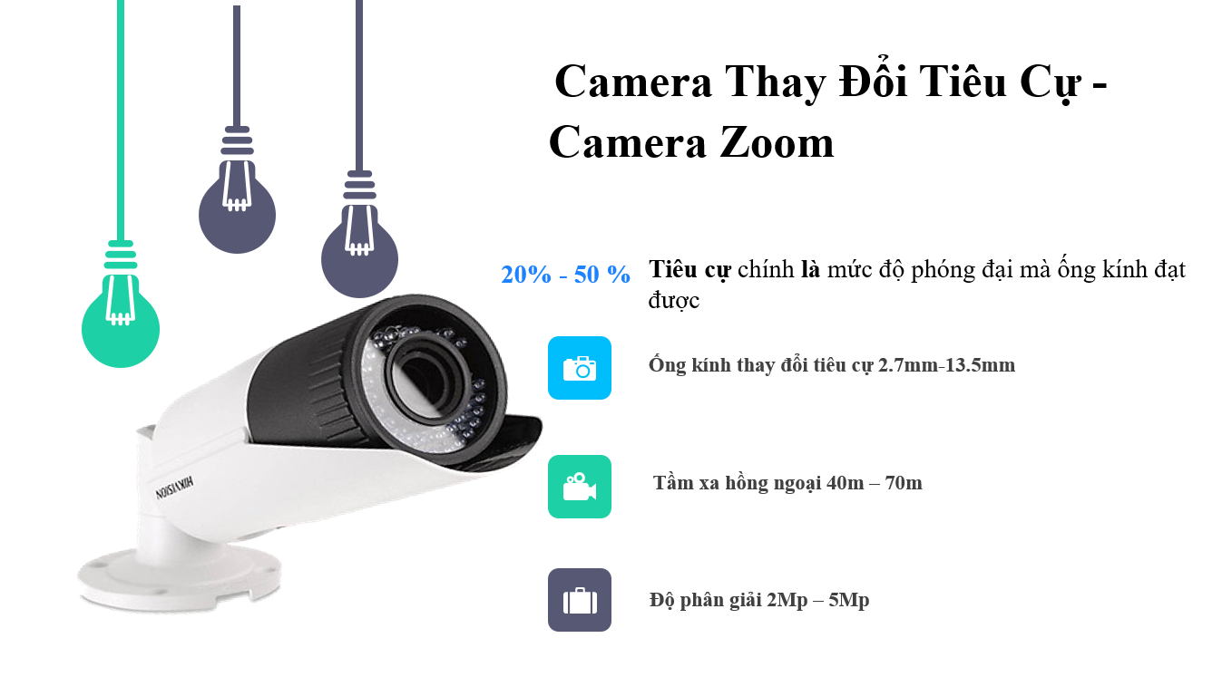 4. Camera thay đổi tiêu cự – Camera Zoom ( Tiêu cự chính là mức độ phóng đại mà ống kính đạt được. Tiêu cự được đo bằng khoảng cách (tính bằng milimet) giữa điểm hội tụ của ống kính và cảm biến hình ảnh) Đây là loại ống kính có khả năng zoom được xa/gần. Đối với camera được trang bị ống kính zoom (tiêu cự thay đổi được) thì nhà sản xuất sẽ cung cấp cả 02 thông số tiêu cự minimum và tiêu cự maximum