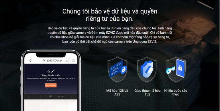 Ứng dụng icloud Ezivz bảo vệ dữ liệu và quyền riêng tư của bạn.Chỉ có bạn mới có chìa khóa để giải mã dữ liệu của mình. Để có thêm một tầng bảo vệ sự riêng tư, bạn luôn có thể bật chế độ ngủ của camera trên Ứng dụng EZVIZ
