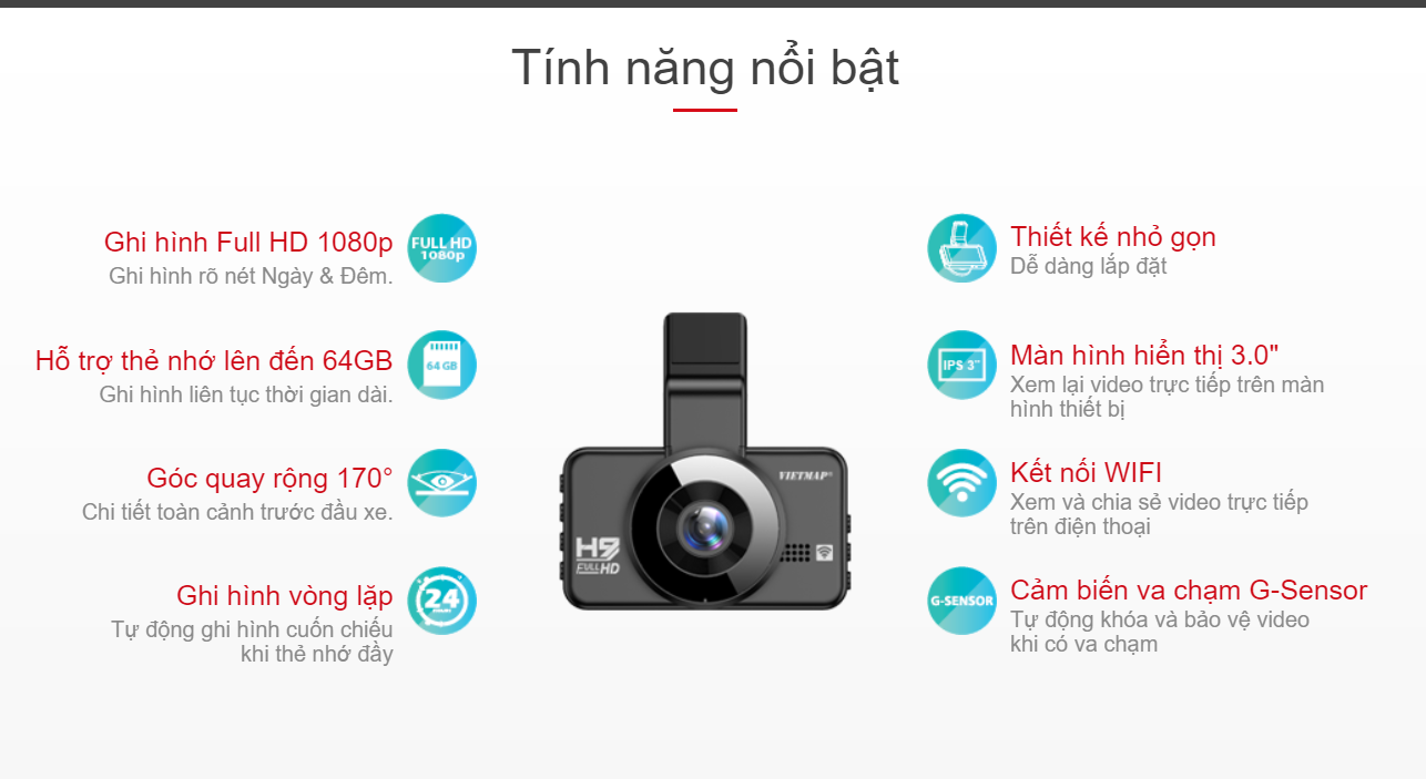 VIETMAP H9 trang bị công nghệ truyền dữ liệu thông qua kết nối WIFI không dây, giúp việc xem lại, lưu trữ chia sẻ video dễ dàng trên các thiết bị hệ điều hành Android, IOS thông qua ứng dụng VIETMAP REC. Camera hành trình Vietmap H9 có chế độ ghi hình Full HD 1080, màn hình hiển thị 3.0″, hỗ trợ thẻ nhớ lên đến 64BG. Vietmap H9 với góc quay rộng lên tới 170 độ, ghi hình vòng lặp. Có kết nối Wifi và cảm biến va chạm G-Sensor.