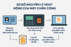 - Dữ liệu chấm công (thời gian, ID nhân viên…) này sẽ được gửi về máy tính khi có yêu cầu từ phần mềm để tiến hành xử lý và xuất ra các báo cáo cần thiết phục vụ quá trình tính lương cho nhân viên.